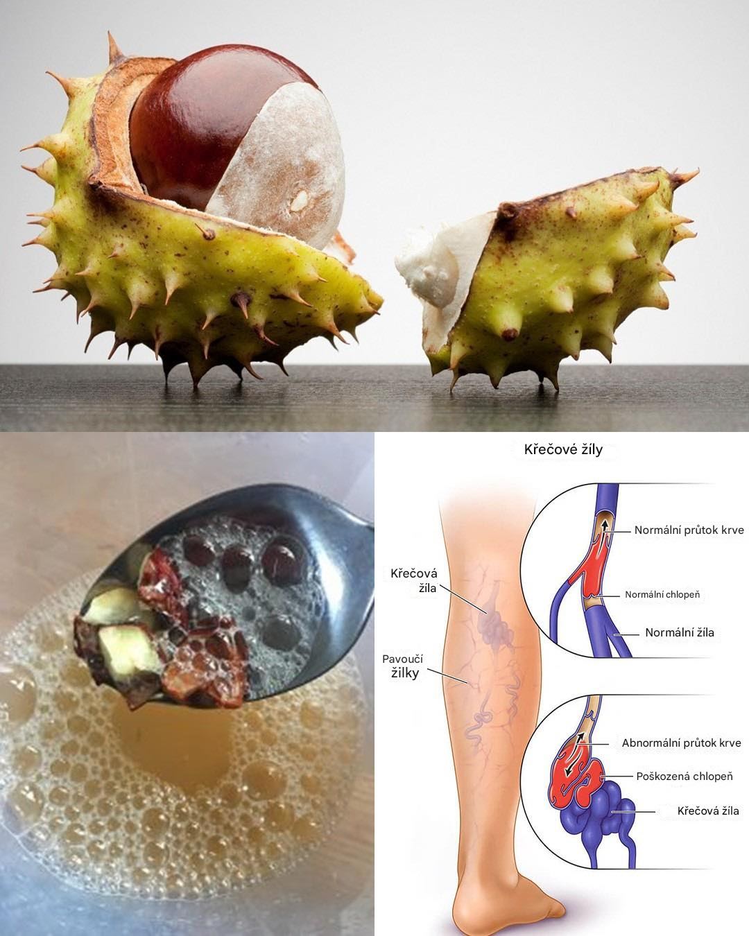 Rozmixujte 10 kaštanů, přidejte 100 ml kokosového oleje a nechte louhovat 7 dní. Poté přeceďte a uchovávejte v chladu. Masírujte nohy večer — úleva je téměř okamžitá.